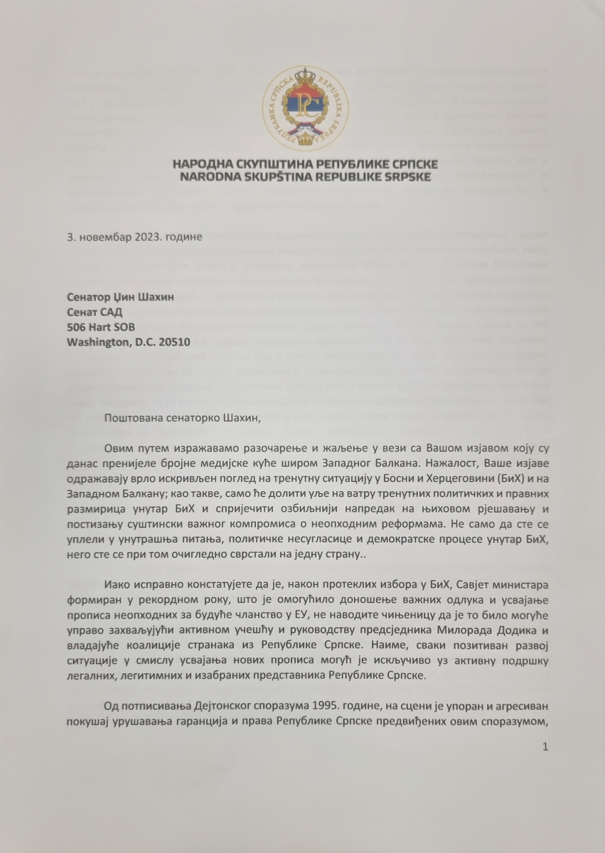 Народна скупштина Републике Српске упутила је данас писмо америчкој сенаторки Џин Шахин, као одговор на њен позив Европској унији да санкционише предсједника Републике Српске Милорада Додика. Поред предсједника Народне скупштине др Ненада Стевандића, писмо су потписали и потпредсједници Народне скупштине Републике Српске Ања Љубојевић и Петко Ранкић, шефови посланичких клубова СНСД-а Игор Жунић, ДЕМОС-а Споменка Стевановић, СП-а Срђан Тодоровић, УС-а Костадин Васић, НПС-а Драган Галић, те посланичких група СПС-а Максим Скоко и ДНС-а Предраг Нешић.