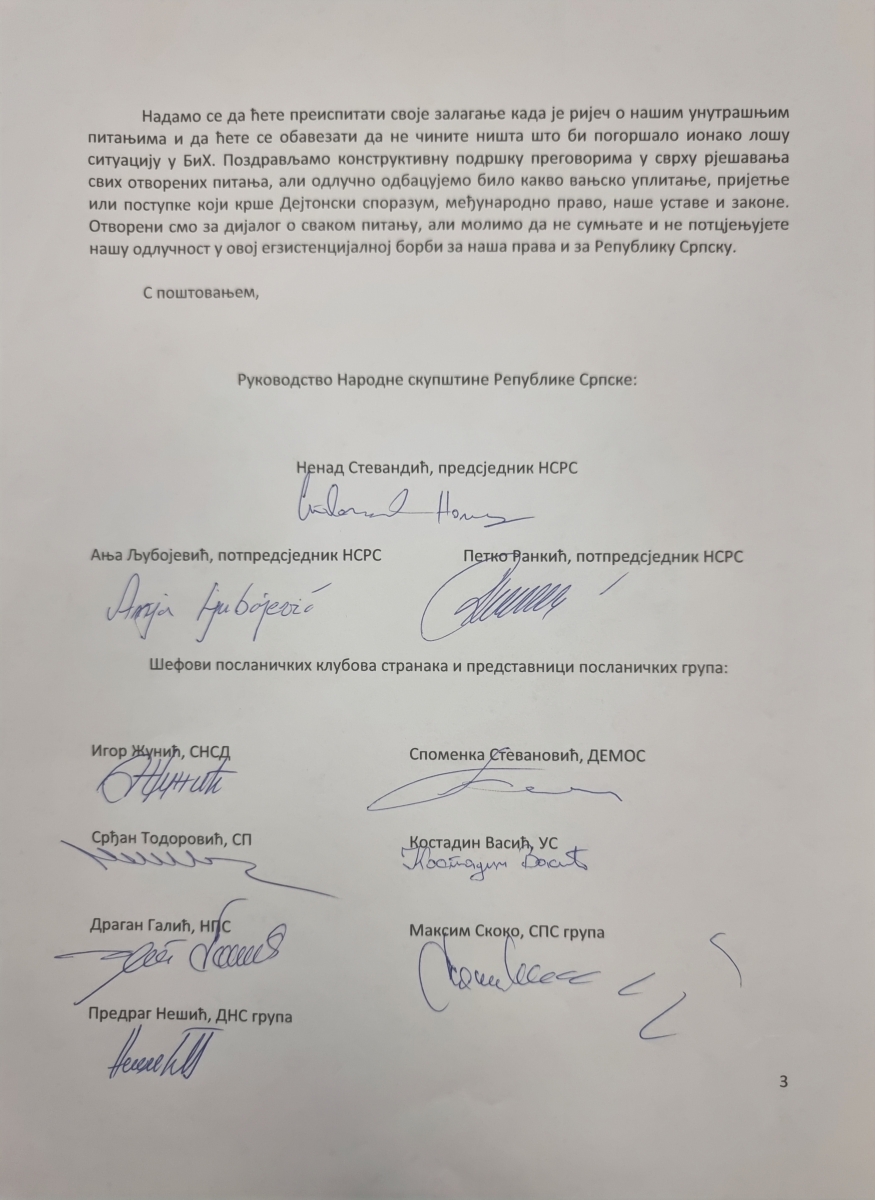 Надамо се да ћете преиспитати своје залагање када је ријеч о нашим унутрашњим питањима и да ћете се обавезати да не чините ништа што би погоршало ионако лошу ситуацију у БиХ. Поздрављамо конструктивну подршку преговорима у сврху рјешавања свих отворених питања, али одлучно одбацујемо било какво вањско уплитање, пријетње или поступке који крше Дејтонски споразум, међународно право, наше уставе и законе. Отворени смо за дијалог о сваком питању, али молимо да не сумњате и не потцјењујете нашу одлучност у овој егзистенцијалној борби за наша права и за Републику Српску“.