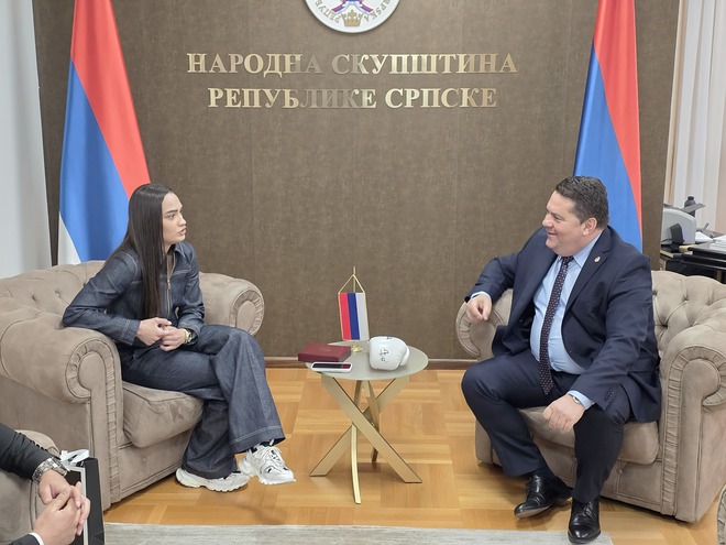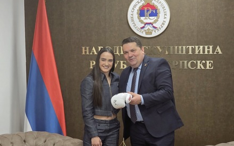 Предсједник Народне скупштине Републике Српске др Ненад Стевандић примио је данас у Бањалуци, у свом кабинету, Сару Ћирковић, која је недавно освојила ИБА професионалну титулу првака свијета у боксу.