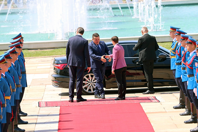 Свечани дочек највиших званичника уз постројене припаднике Гарде приређен је испред Палате Србије. Предсједника Додика дочекао је предсједник Србије Александар Вучић, а потом су оба предсједника дочекала и српског патријарха Порфирија. Дочек су пратила црквена звона.