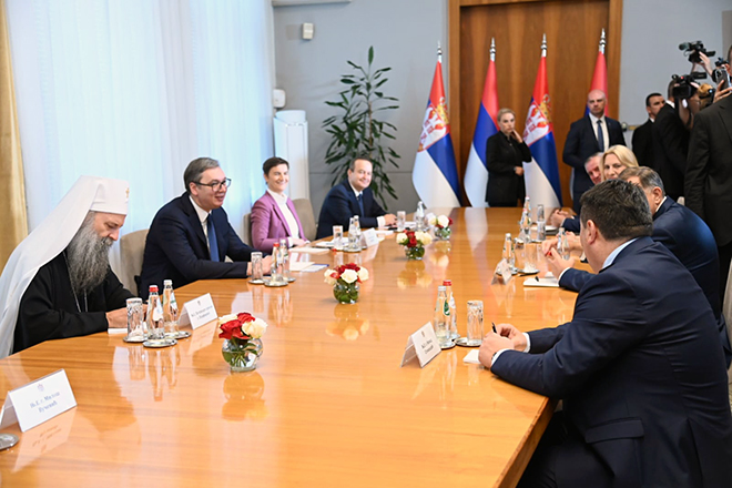 На састанку у Палати Србија били су још и српски члан Предсједништва БиХ Жељка Цвијановић, предсједник Народне скупштине Србије Ана Брнабић, премијери Радован Вишковић и Милош Вучевић, као и Његова светост патријарх српски Порфирије.
