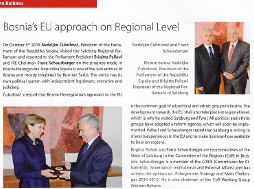 Časopis Instituta za regije Evrope „News Region“, u svom decembarskom izdanju, objavio je tekst o posjeti predsjednika Narodne skupštine Republike Srpske parlamentu Salcburga 5. oktobra 2016.