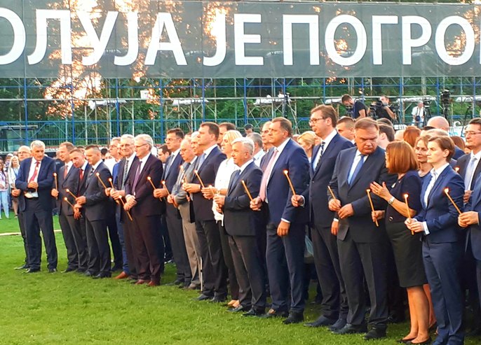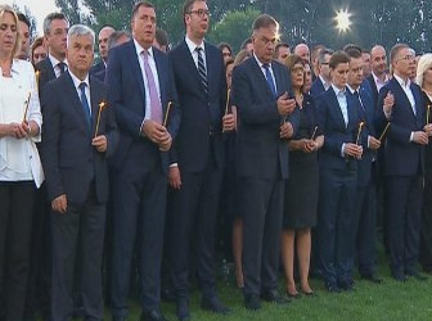 - Oni neka slave. Mi koji smo večeras plakali možemo s ponosom da gledamo u budućnost - rekao je Vučić i podsjetio da za strašan zločin nad Srbima niko nije odgovarao.
