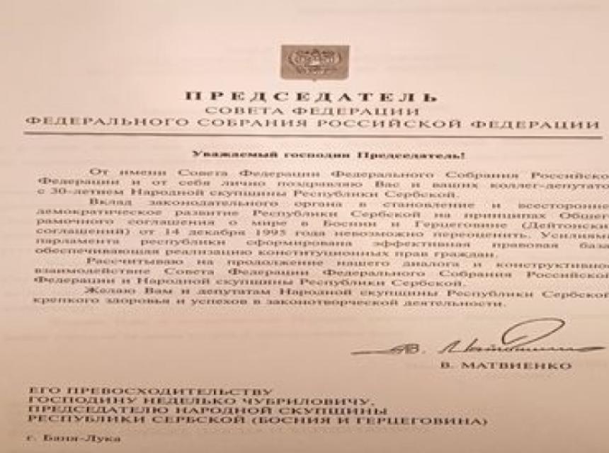 Predsjedniku Narodne skupštine Republike Srpske Nedeljku Čubriloviću danas je stigla čestitka povodom 30 godina postojanja i rada najvišeg zakonodavnog tijela Srpske od predsjednice Savjeta Federacije Federalne skupštine Ruske Federacije Valentine Matvijenko.