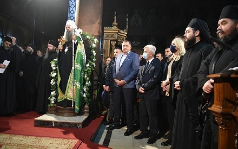 Predsjednik Narodne skupštine Republike Srpske Nedeljko Čubrilović, predsjednica Srpske Željka Cvijanović i srpski član Predsjedništava Milorad Dodik dočekali su Patrijarha Porfirija u Hramu Svete Trojice u Banjaluci.